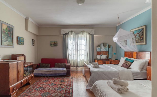 First floor fabulously ‘Art-Deco-rated’ private apartment features an open plan living area with both a double and single bed to sleep three. The ensuite toilet wet room has a shower only. The kitchenette has a refrigerator, kettle, kitchenware, small oven and a microwave.